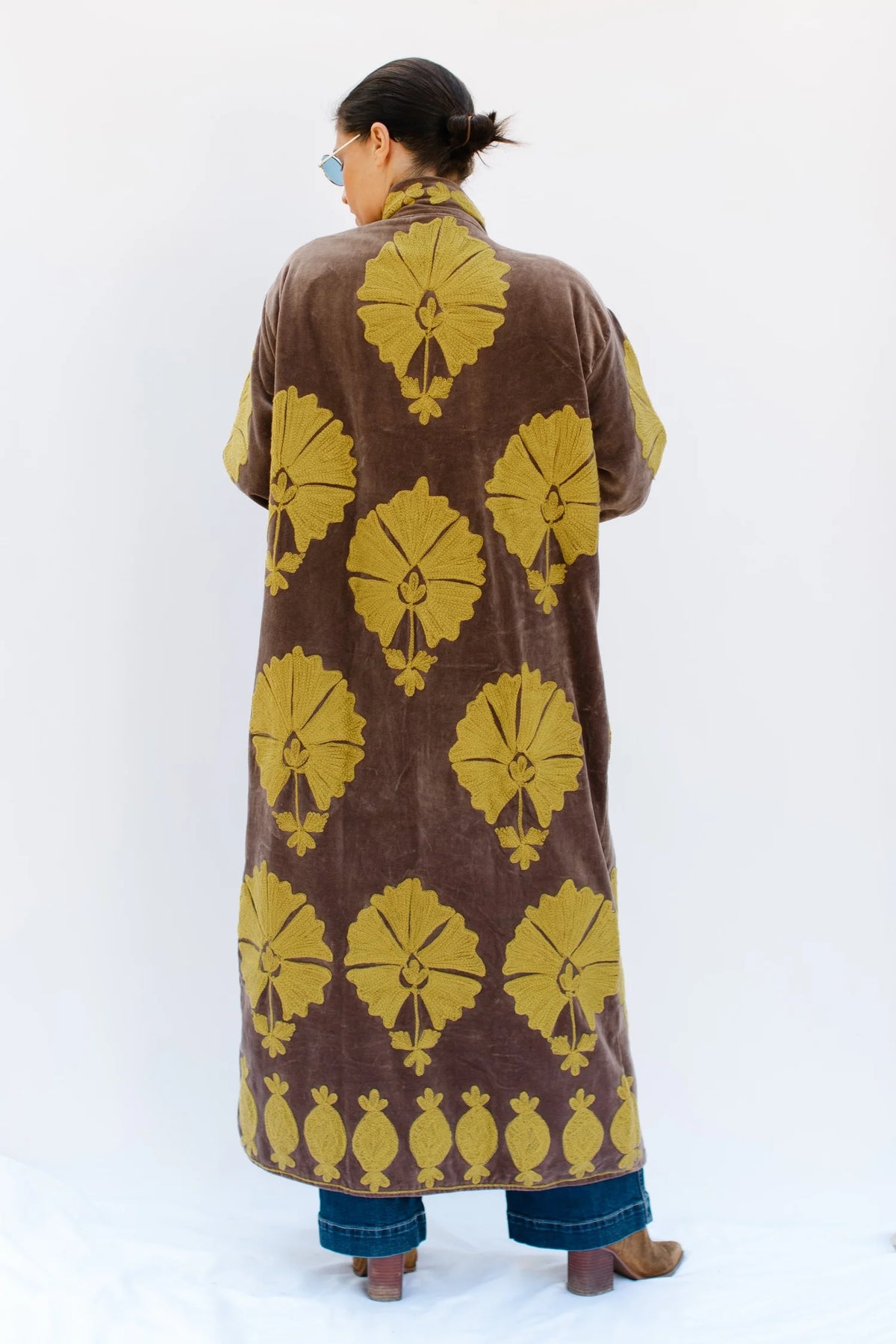 Command attention in this statement-making velvet duster, finished with bold Suzanni embroidery that feels equal parts rock-and-roll and heirloom artistry. With its tailored silhouette and dramatic sweep, it’s the kind of piece that instantly transforms a simple outfit into a full look. Throw it over denim for an effortless day vibe or layer it with silks and boots when you’re ready to steal the spotlight.