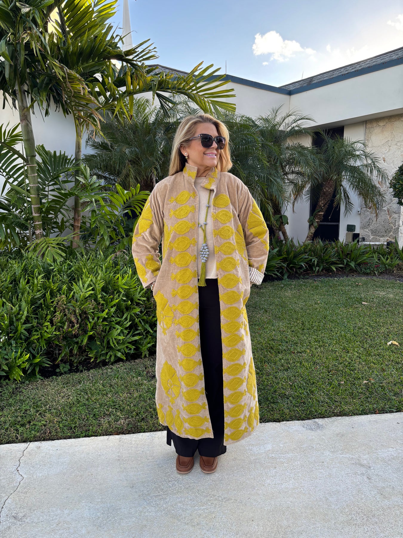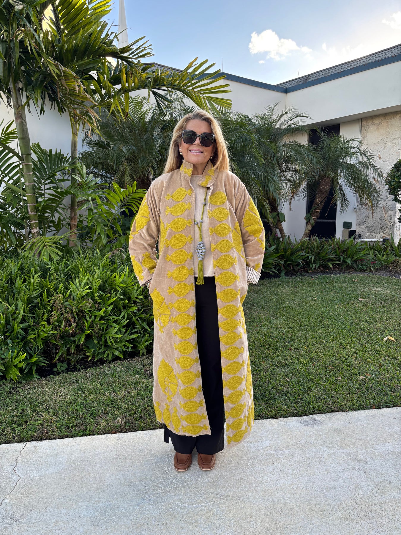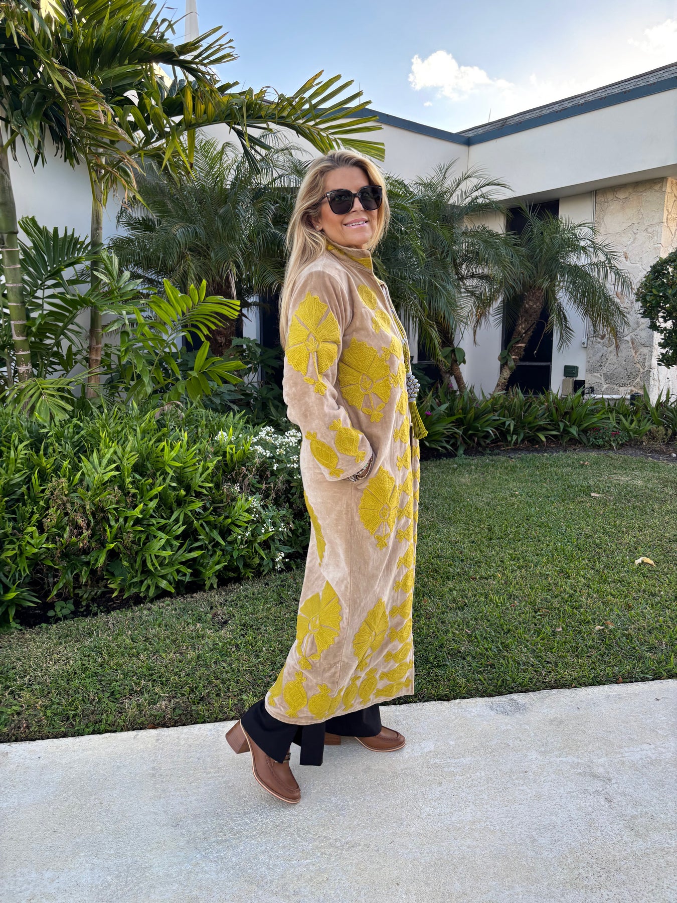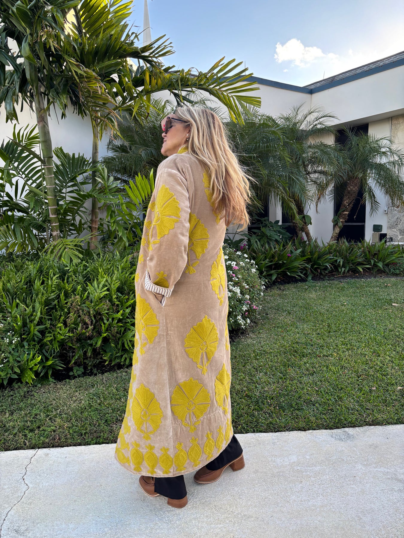 Command attention in this statement-making velvet duster, finished with bold Suzanni embroidery that feels equal parts rock-and-roll and heirloom artistry. With its tailored silhouette and dramatic sweep, it’s the kind of piece that instantly transforms a simple outfit into a full look. Throw it over denim for an effortless day vibe or layer it with silks and boots when you’re ready to steal the spotlight.