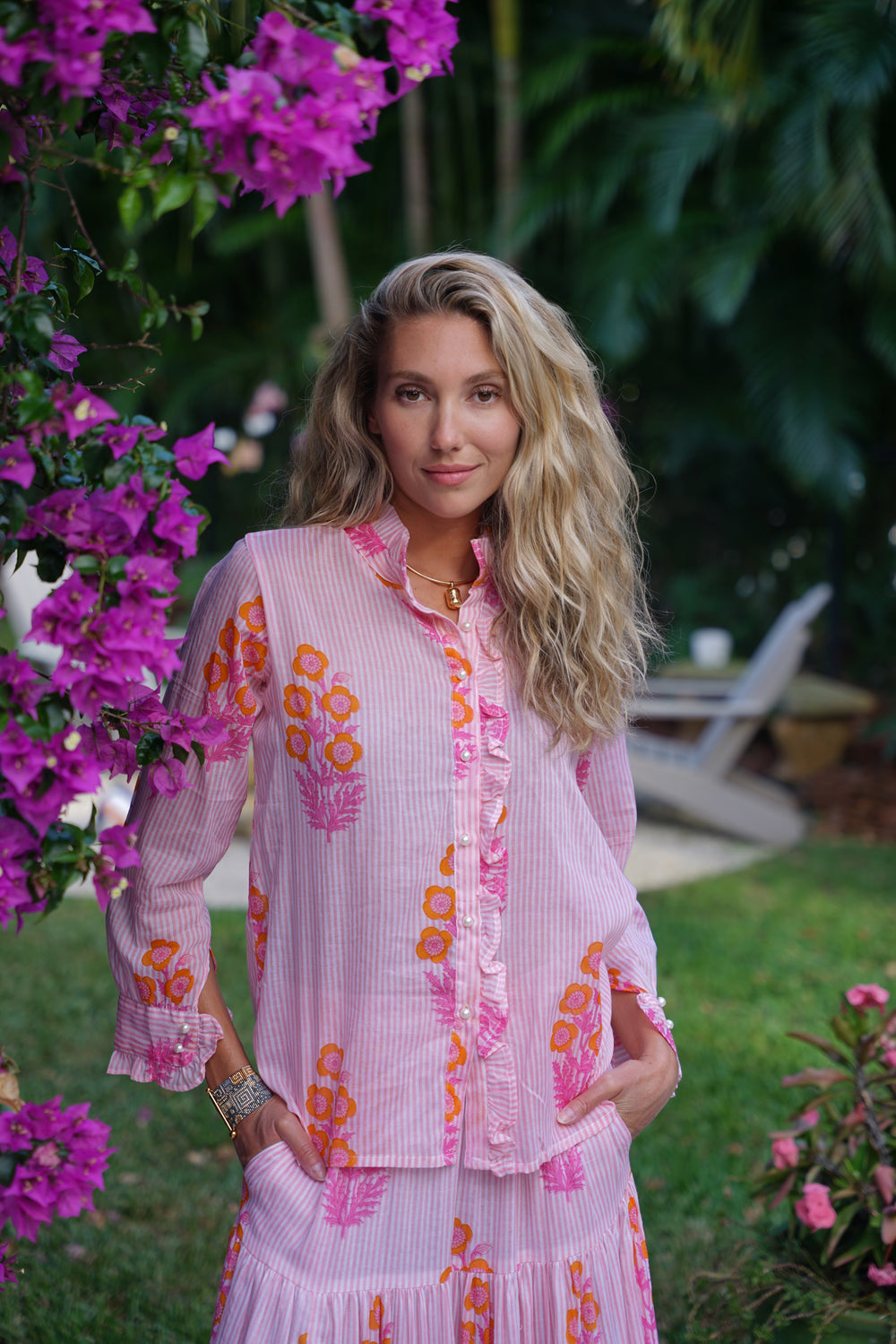 A versatile layering piece with a relaxed fit and feminine ruffle detail along the button front, perfect for everyday style.